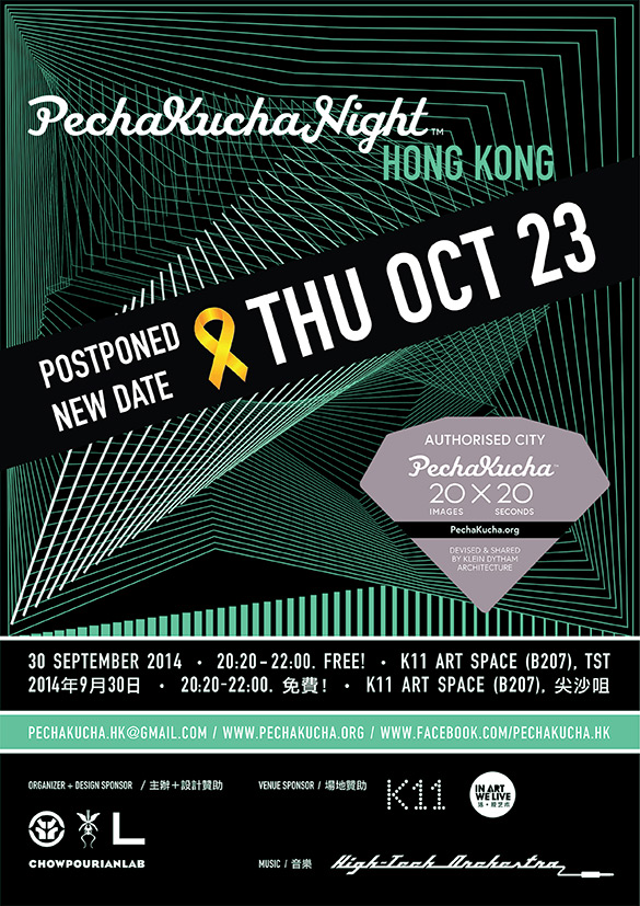 Next PechaKucha Night HK has been rescheduled to Thursday, October 23, 2014.