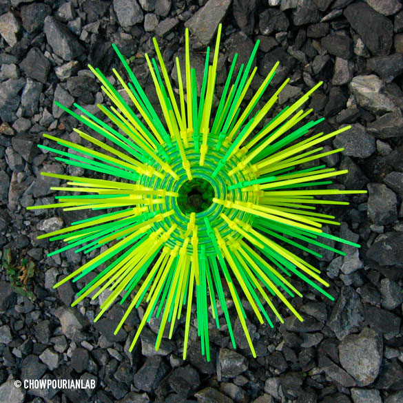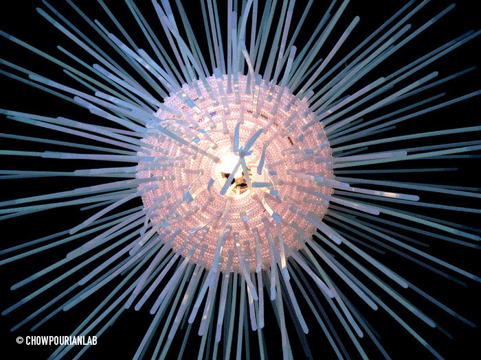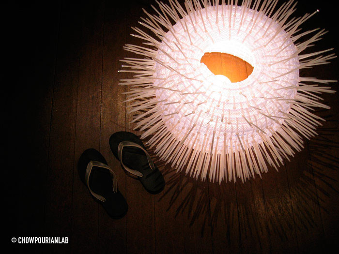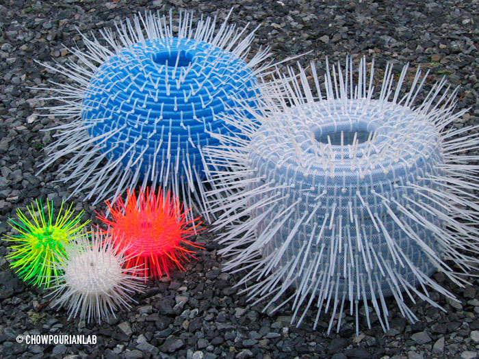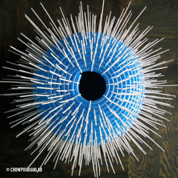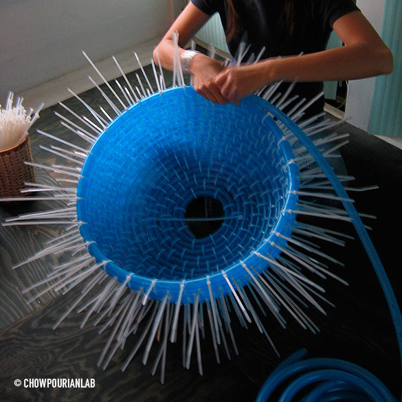 Traditional craft mixed with modern materials. Plumbing hose and cable ties take on a new life as sculpture / lighting / furniture via coil weaving. Inspired by visits to the Tsukiji market and my favourite fish, uni is ‘sea urchin’ in Japanese.